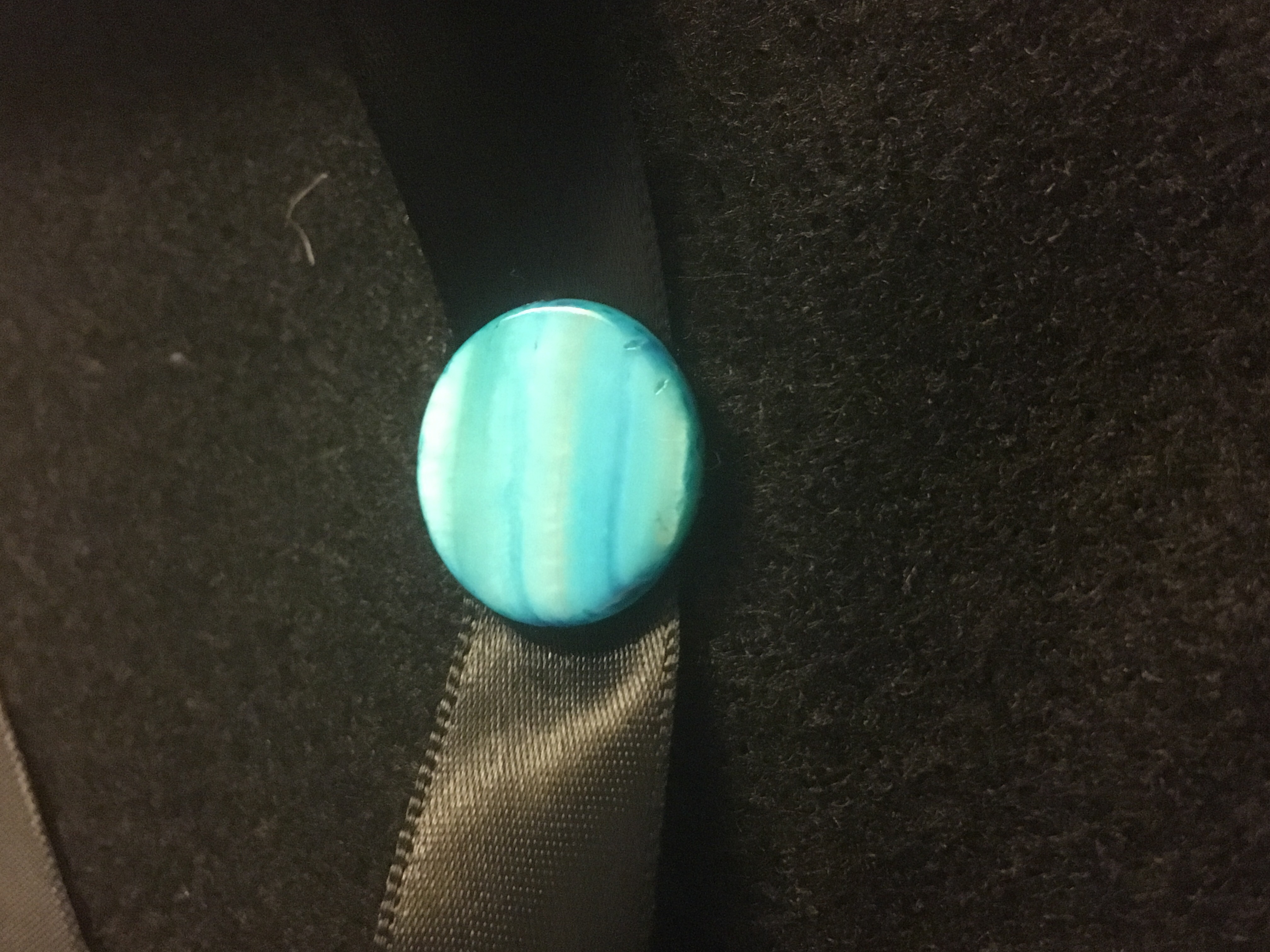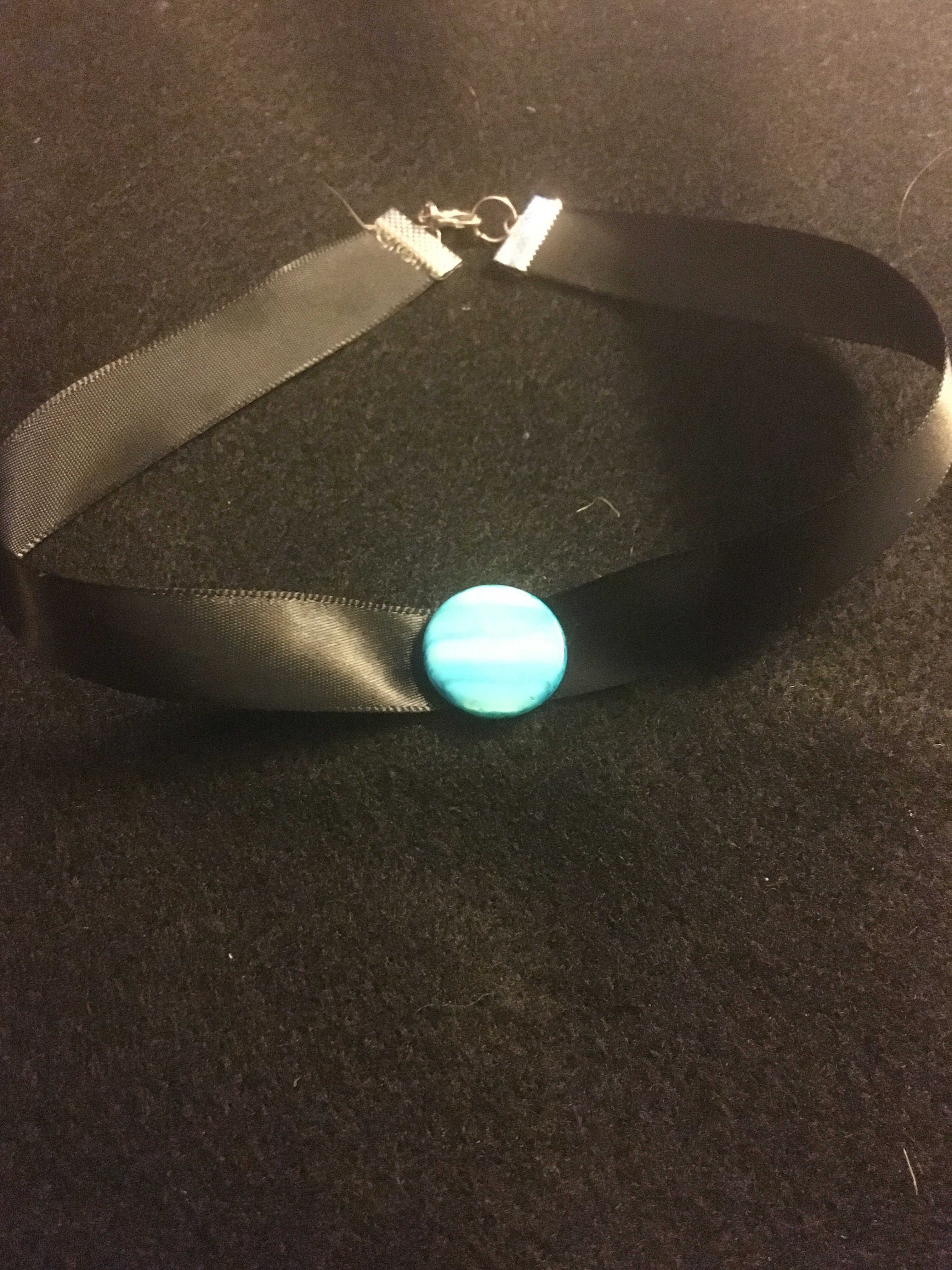 Blue shell like stone on black ribbon with silver tone detail and closure.